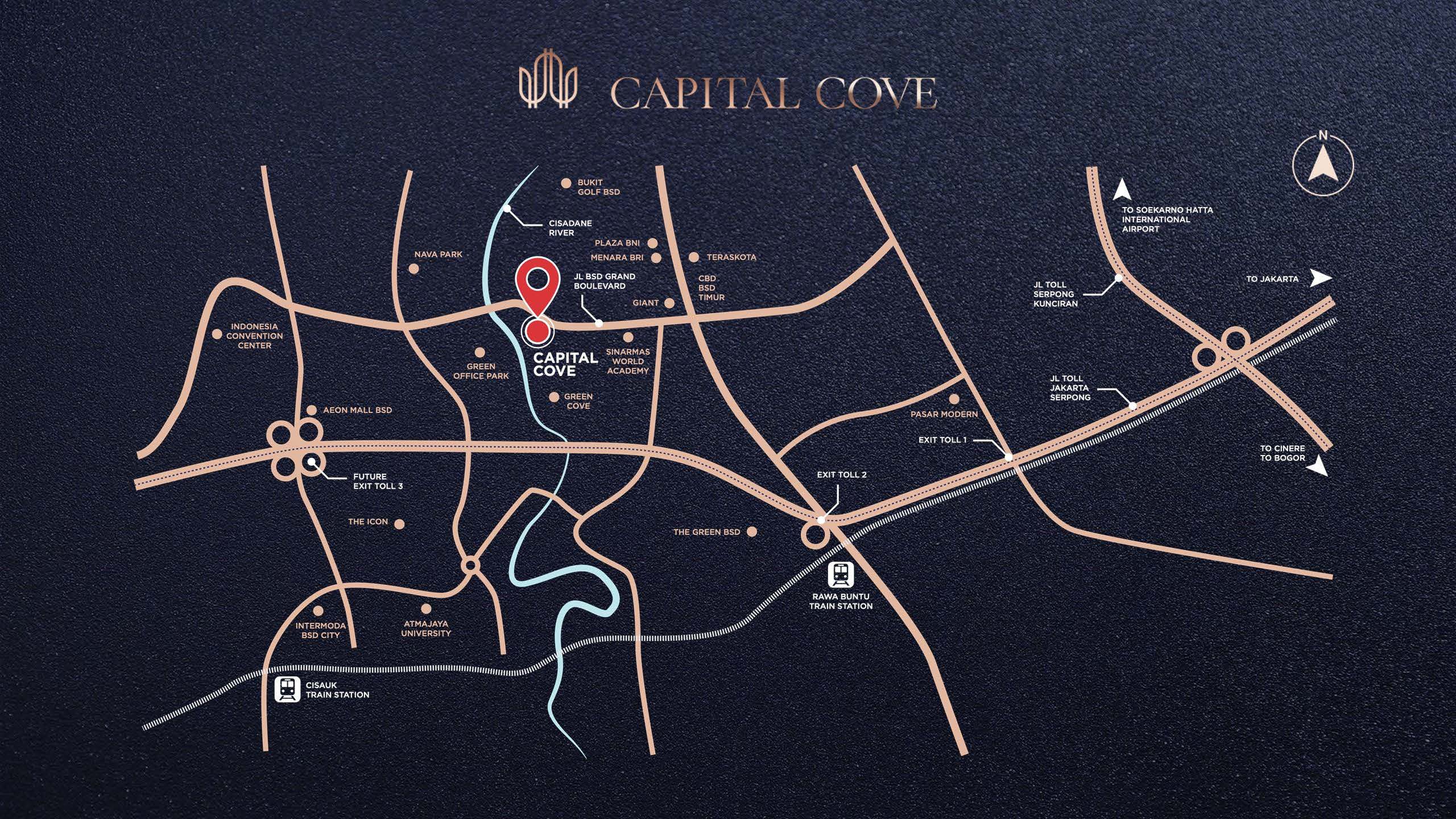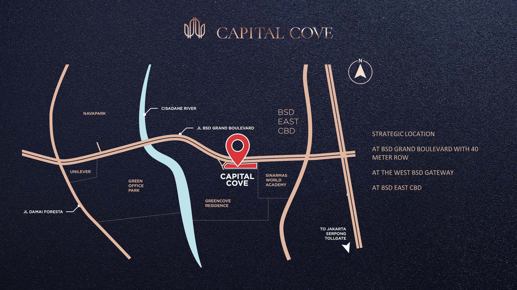 Office building Capital Cove BSD City berada dilokasi strategis yaitu di Jln. BSD Grand Boulevard. Tepatnya berada didepan cluster Green Cove BSD City. Lokasi ini terbilang dilokasi utama BSD City Serpong Tangerang.